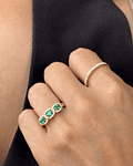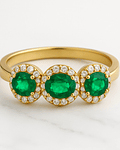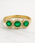 Anillo compuesto por 3 Maravillosas Esmeraldas Ovaladas, rodeadas de halo de brillantes redondos, en Oro Amarillo 18K.