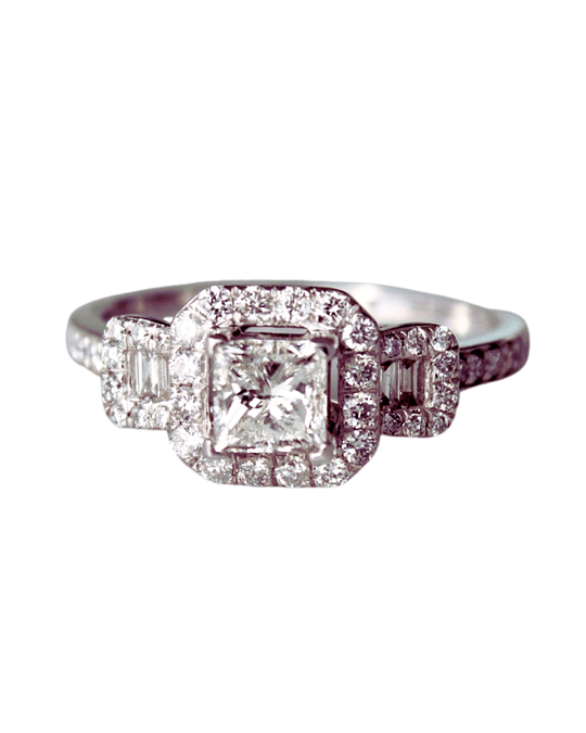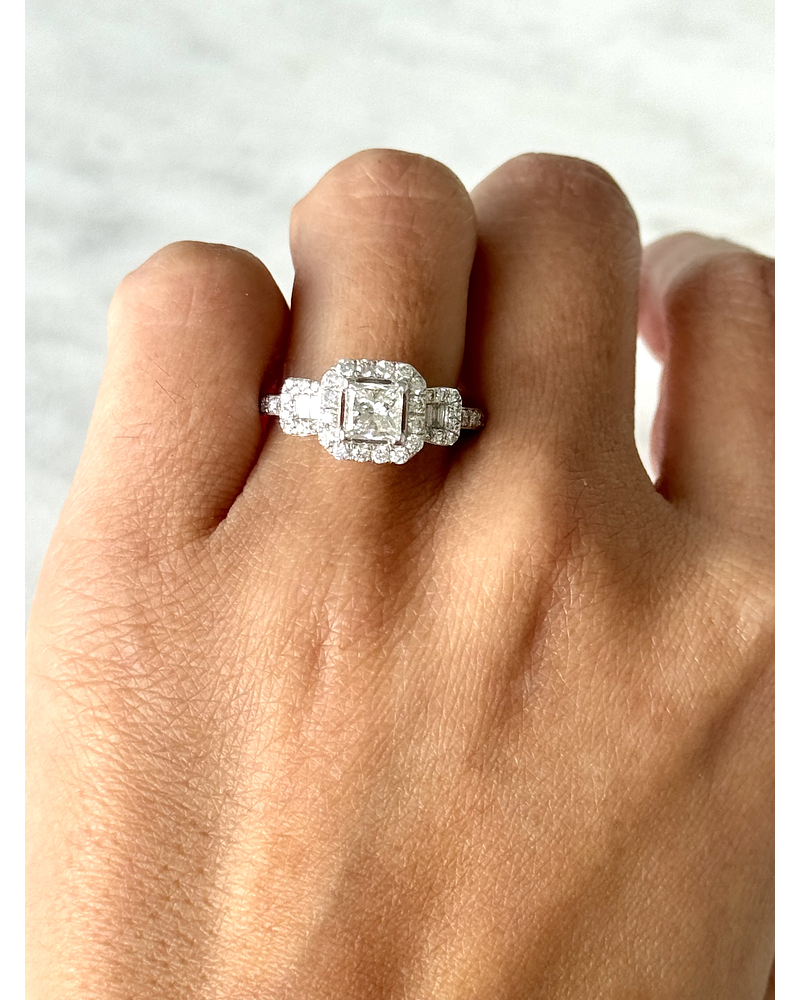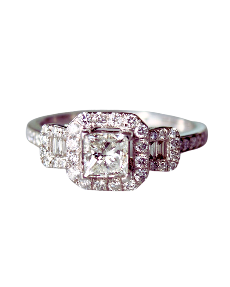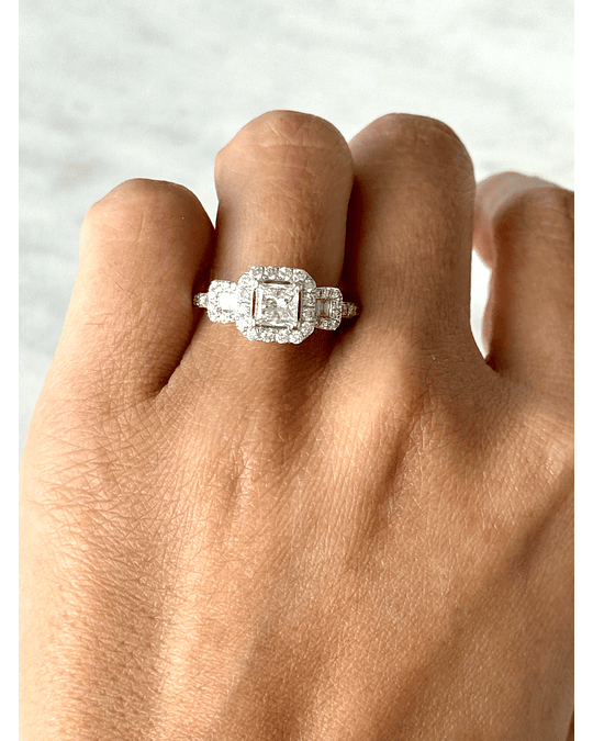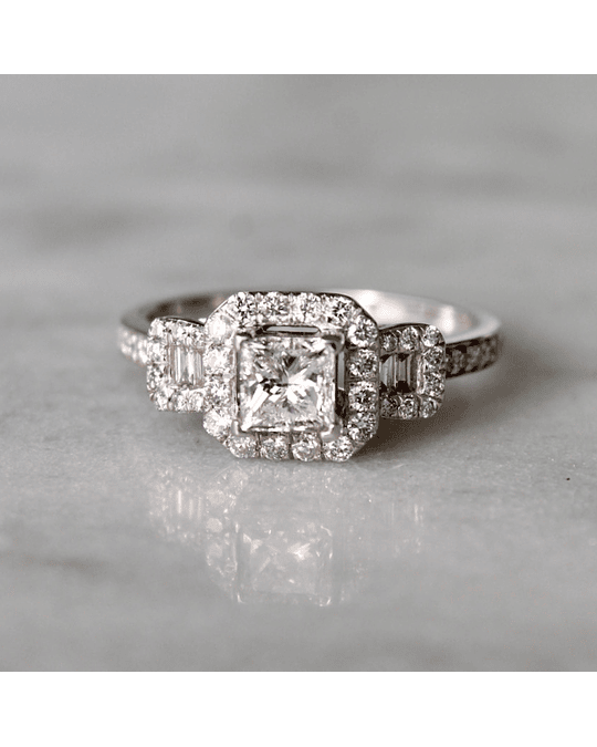 Hermoso Anillo Compuesto por Diamante Princess (Corte cuadrado) de 70 puntos, acompañado de Diamantes Baguette y Brillantes, completando 1.21 Ct en total, en Oro Blanco 18k.