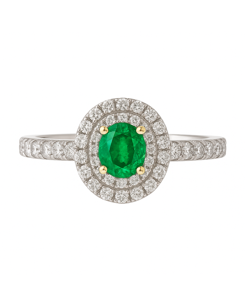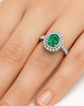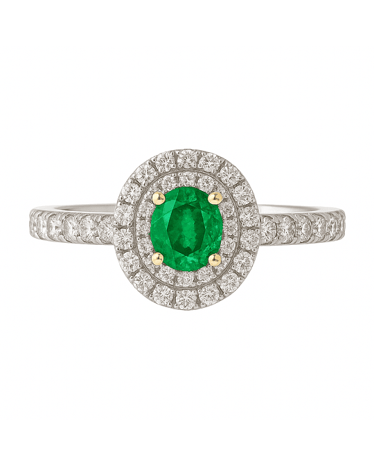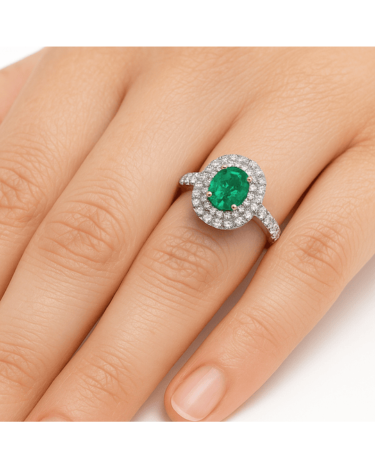 Impactante Anillo compuesto por Gran Esmeralda corte Ovalada, Certificada Internacionalmente, rodeada de un doble halo de brillantes y en los hombros, en Oro Blanco 18K Exclusivo!