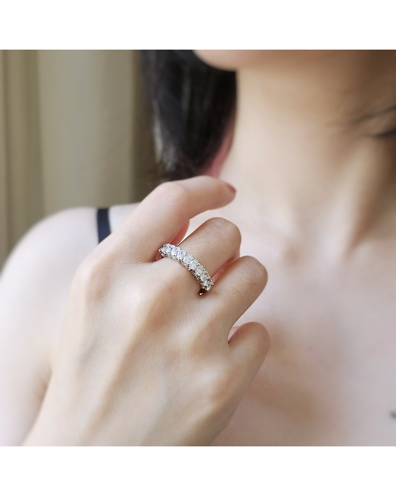 Elegancia exclusiva. Este clásico anillo medio cintillo es la personificación de la sofisticación. Con 11 diamantes de corte oval, que suman 1.03 quilates, engastados en grifa y oro blanco de 18K, es una joya que trasciende las modas y se convierte en un tesoro eterno.