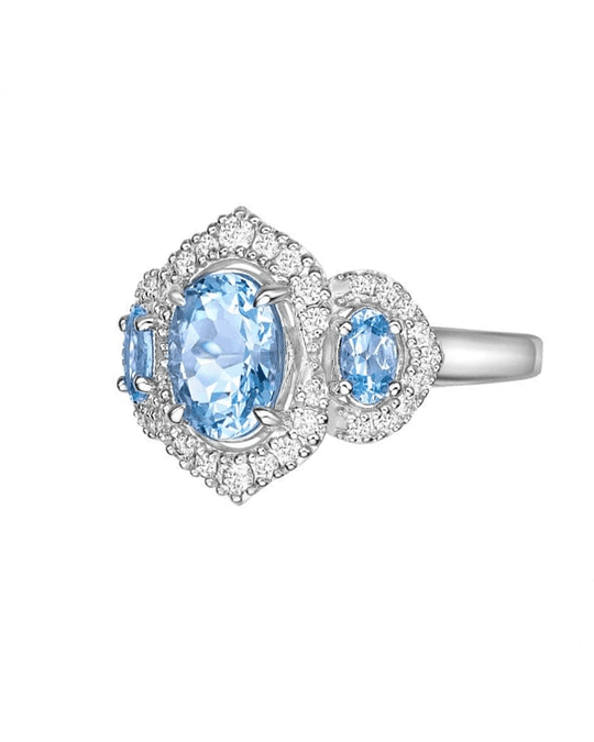 Gran Anillo compuesto por 3 hermosas Aguamarinas Corte Ovalado, rodeadas de brillantes, en Oro Blanco 18K. Diseño Vintage.