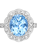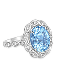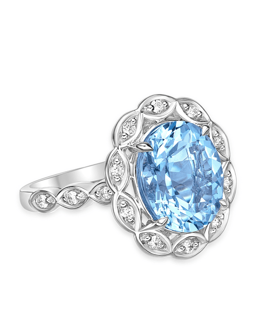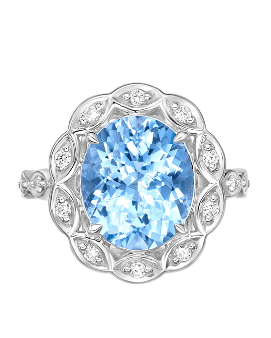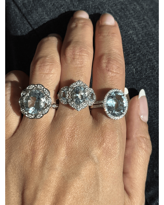 Gran Anillo compuesto por hermosa Aguamarina Corte Ovalado, rodeada de brillantes, en Oro Blanco 18K.