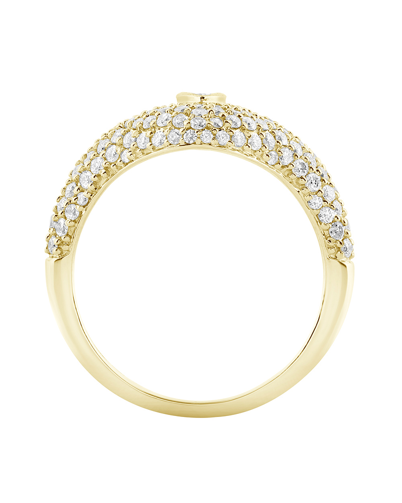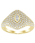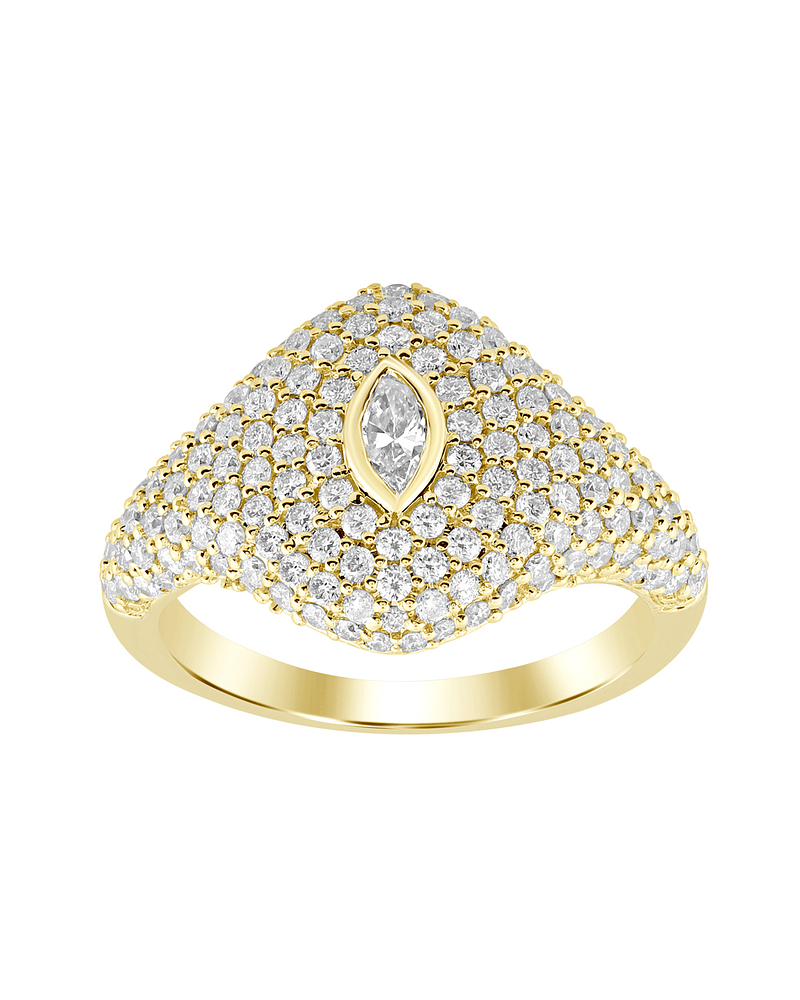 Precioso Anillo Ancho y moderno, compuesto por Diamantes en gastados en Pavé, con un Hermoso Diamante Corte Marquise destacando en el centro, hecho en Oro Amarillo 18K.
