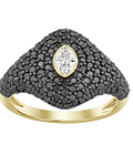 Precioso Anillo Ancho y moderno, compuesto por Diamantes Negros en gastados en Pavé, con un Hermoso Diamante Marquise destacando en el centro, hecho en Oro Amarillo 18K.