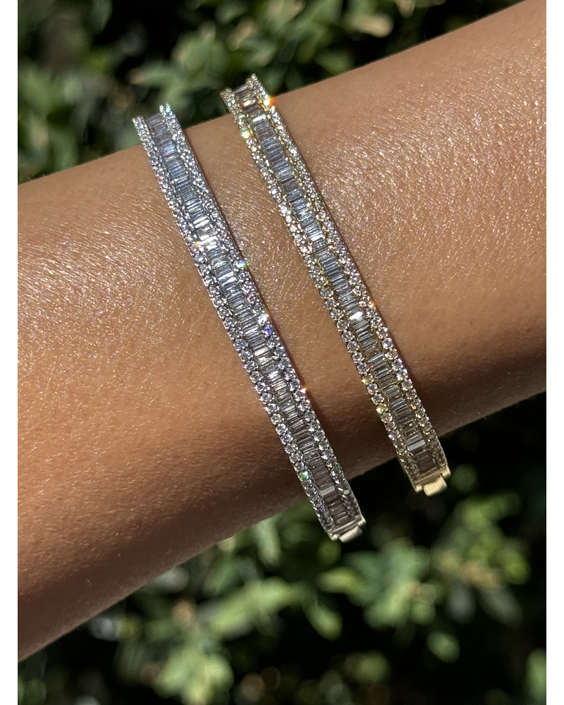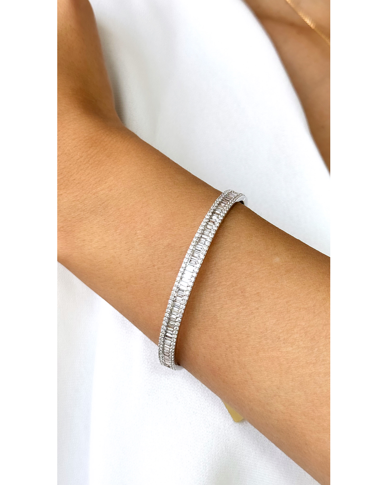 Bellísima pulsera tipo esclava de Oro Blanco 18K con Hermoso Diamante Corte Baguette. Diseño moderno. Una pieza muy elegante, pero a la vez versátil y de uso diario.