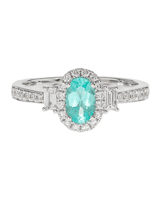 Hermoso Anillo compuesto por hermosa Turmalina Paraiba Natural, corte ovalado, rodeada de brillantes, en Oro Blanco 18K.